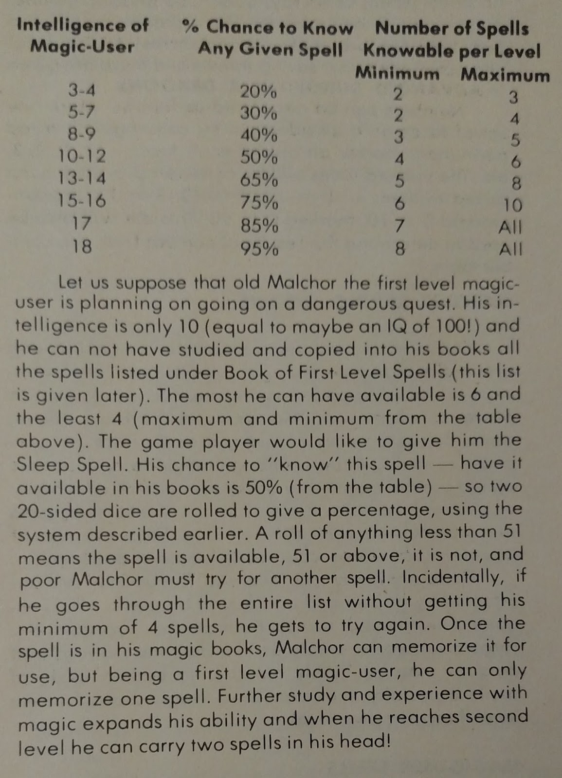 - And then check out this sentence: “Although the magic-user must immediately cease checking to determine if spells are known after the first complete check of each spell in the level group, or immediately thereafter during successive checks when the minimum number of spells which can be known is reached, it is possible to acquire knowledge of additional spells previously unknown as long as this does not violate the maximum number of spells which can be known.” Jeeziz, Gary.