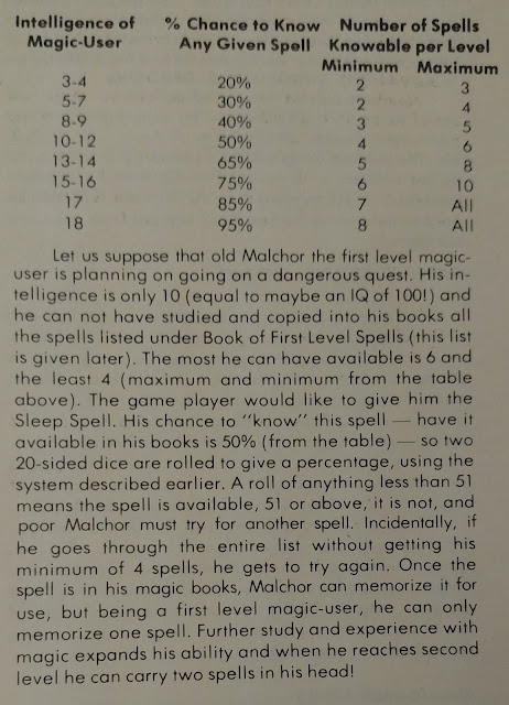 Then someone kindly pointed out that the above percentages apply to learning spells that you find lying around amongst owlbear pellets. It takes Gygax about five paragraphs to explain this chart, and... well, let's say that clarity is not among its virtues.
